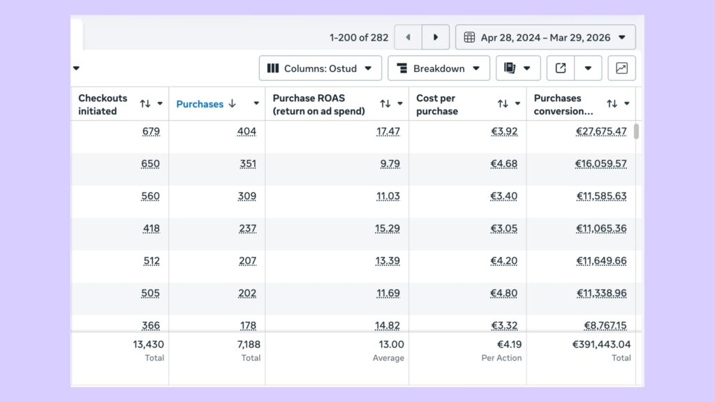 E-pood, kelle turundaja osales meie sotsiaalmeedia koolitustel, on pärast alates teinud 23 kuuga 7188 ostu ja 391 443 eurot käivet. Keskmine ROAS 13x. Kulu ostu kohta 4,19 eurot.