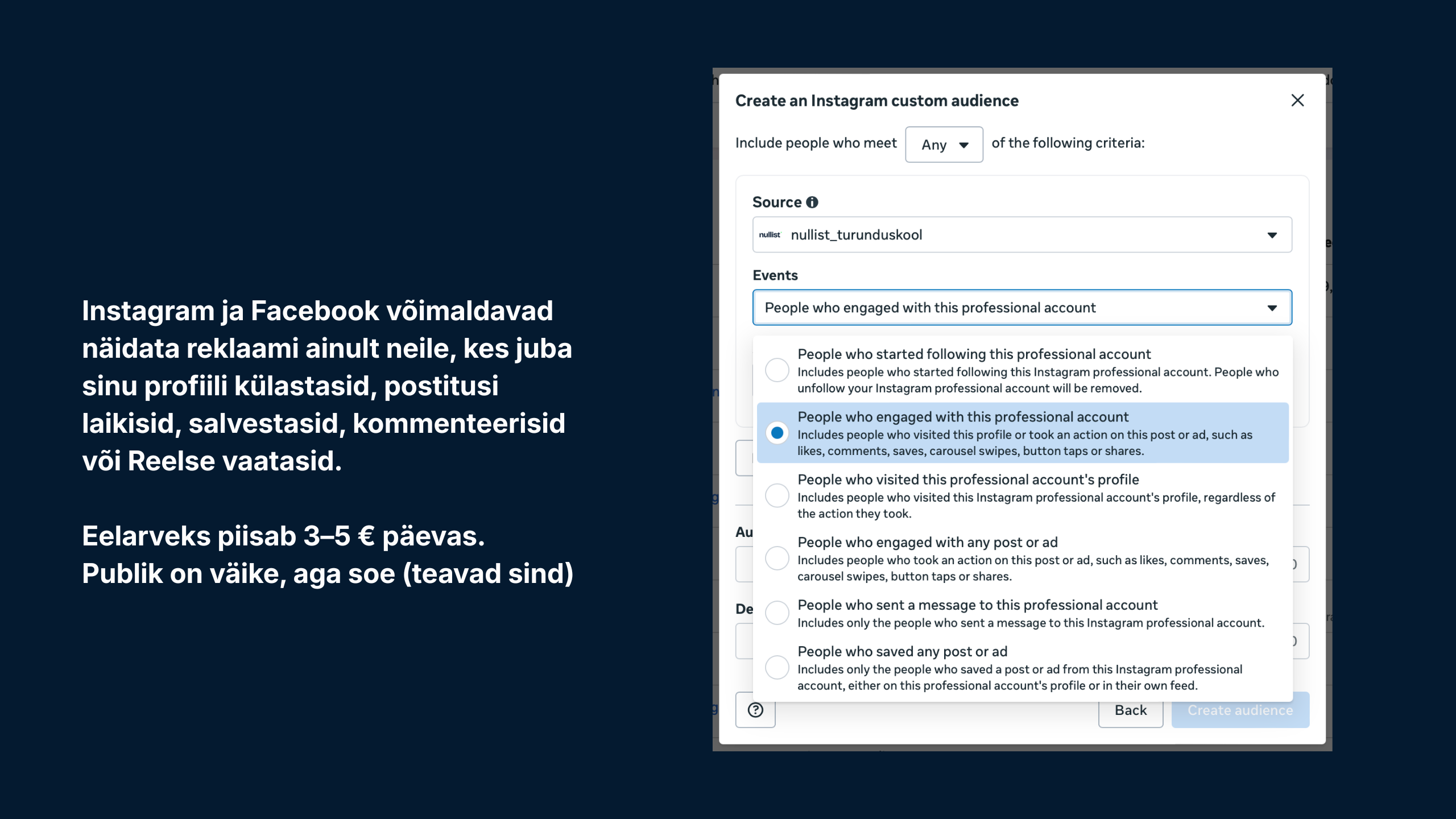 Instagram ja Facebook võimaldavad näidata reklaami ainult neile, kes on juba sinu kontoga kokku puutunud: profiili külastanud, postitust laikinud, selle salvestanud, kommenteerinud või Reelsi vaadanud.